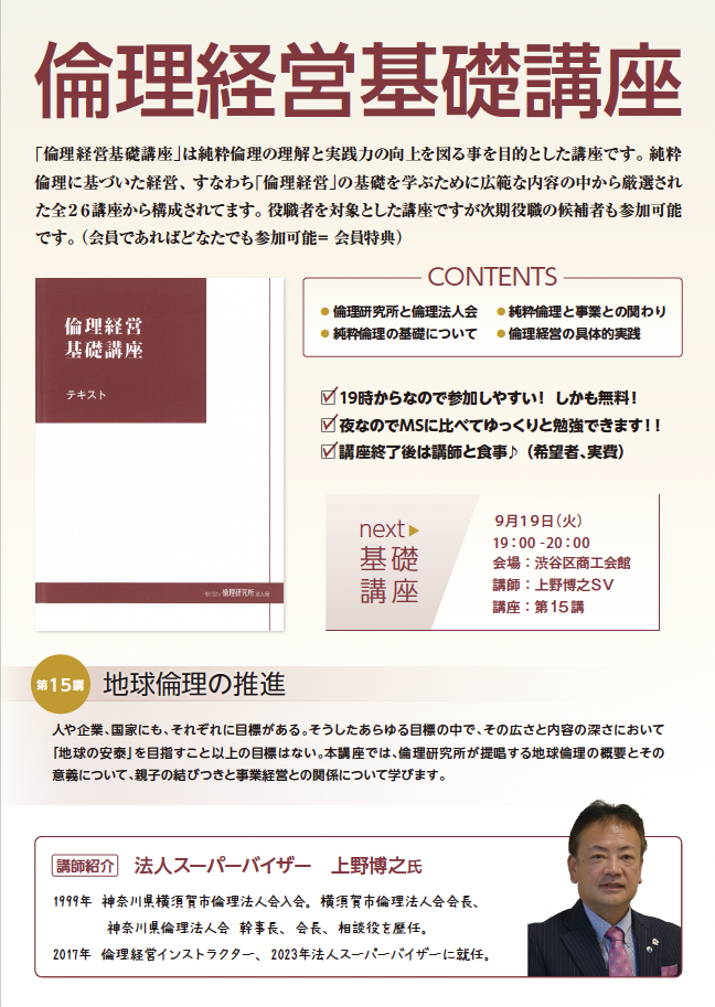 9月19日 倫理経営基礎講座 [第15講] Post Share 第15講 地球倫理の推進 【講話者】 法人スーパーバイザー アシスト・クルー(株)代表取締役 上野博之氏 【日時】 7月18日(火)19時~20時 【会場】 渋谷区商工会館 Post Share
